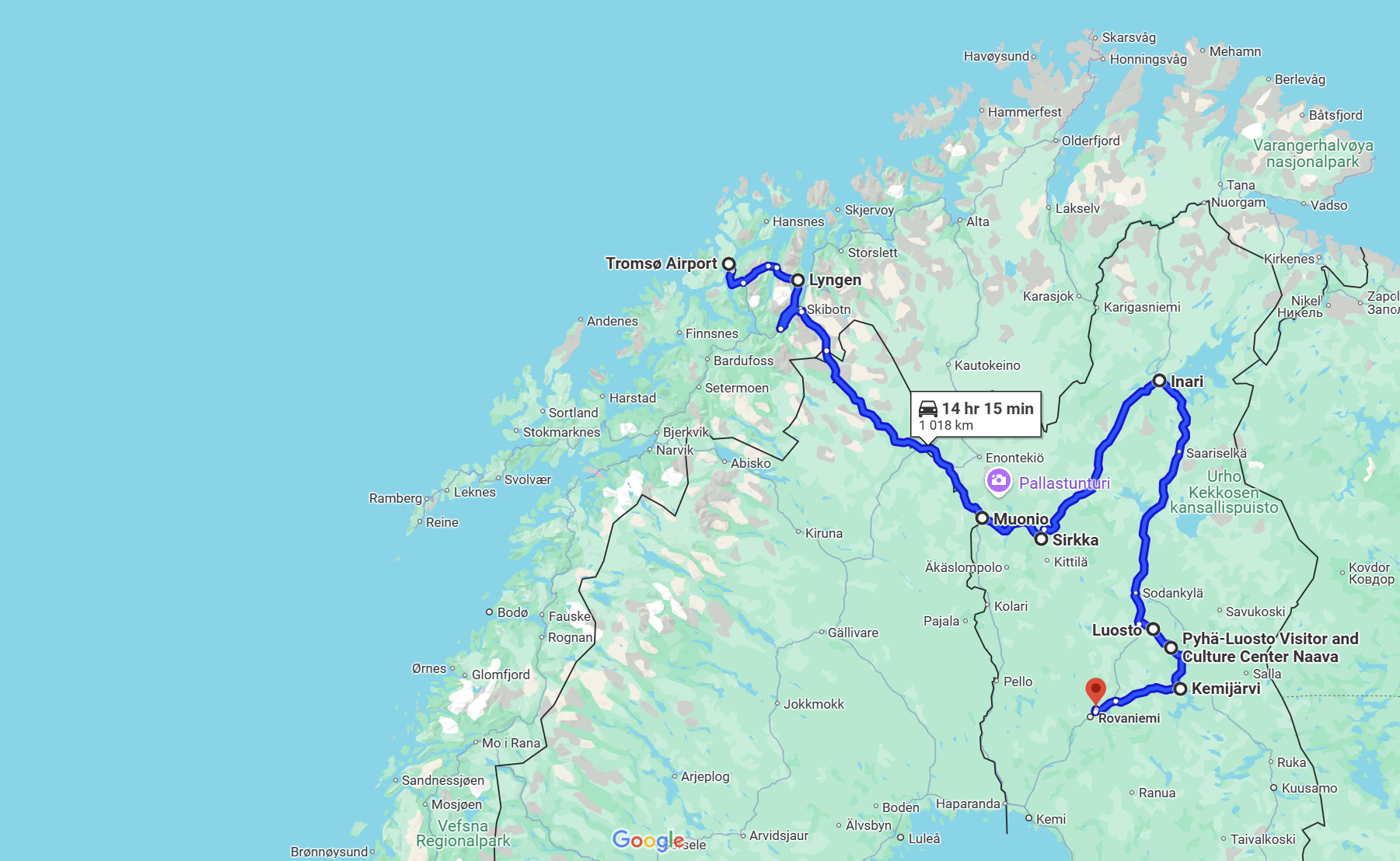 Route: Tromsø - Lyngen - Muonio - Sirkka - Inari Sales workshop / Inari - Luosto-Pyhä - Rovaniemi